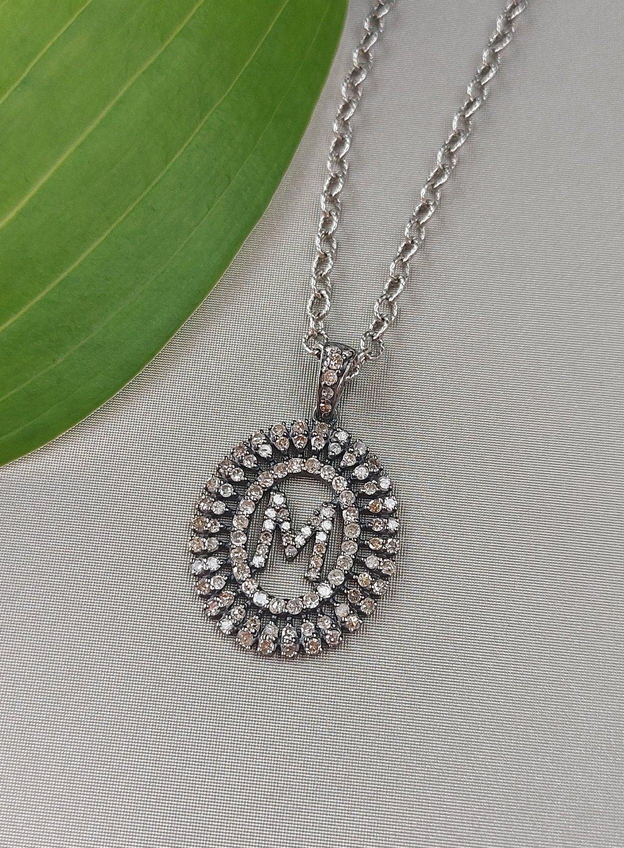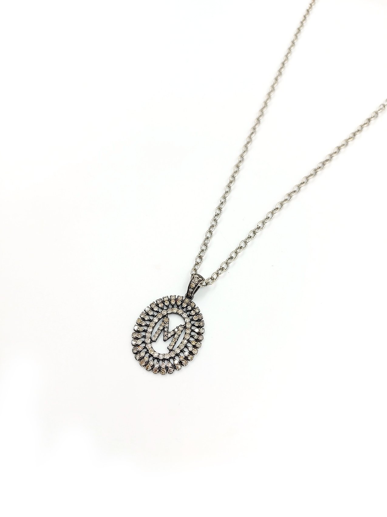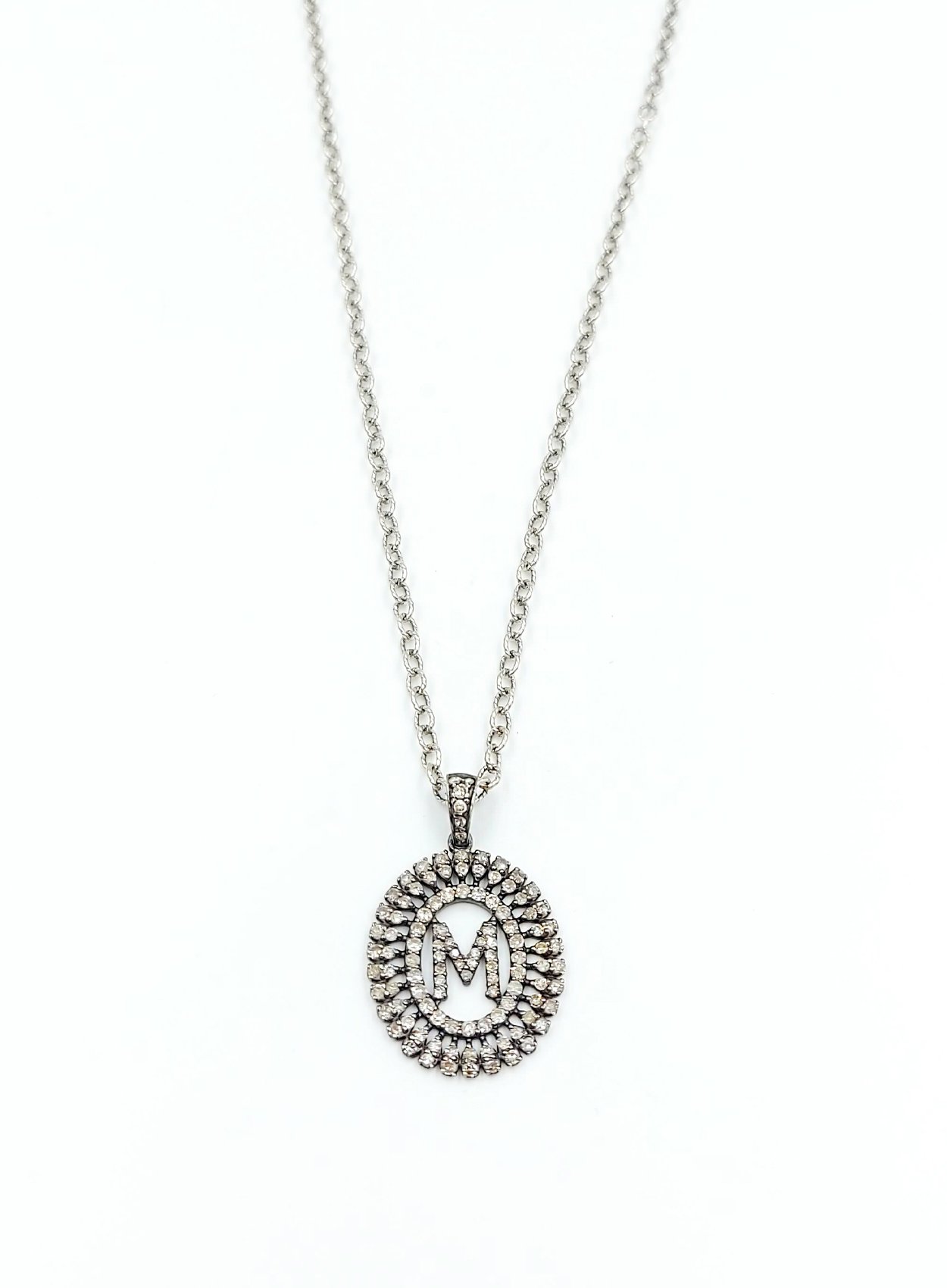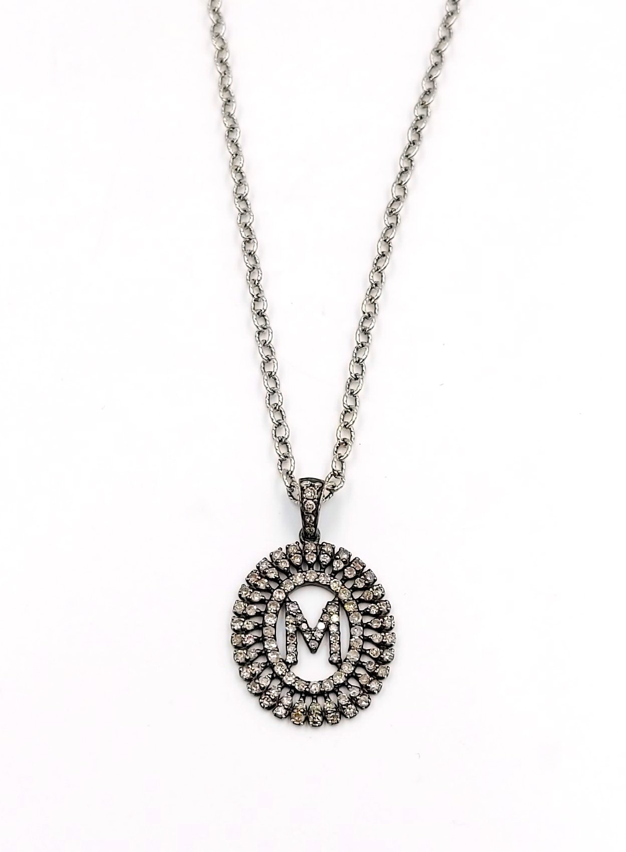 Baguette Diamond Monogram M Necklace on oxidized sterling silver chain. 16-18″ long necklace