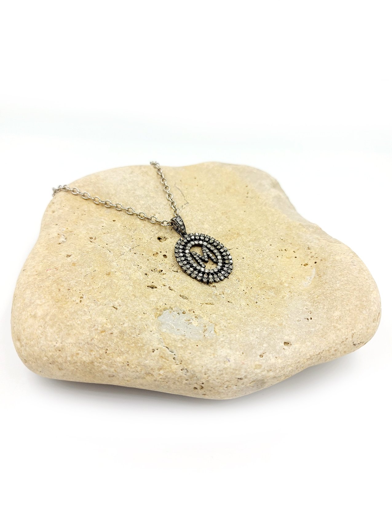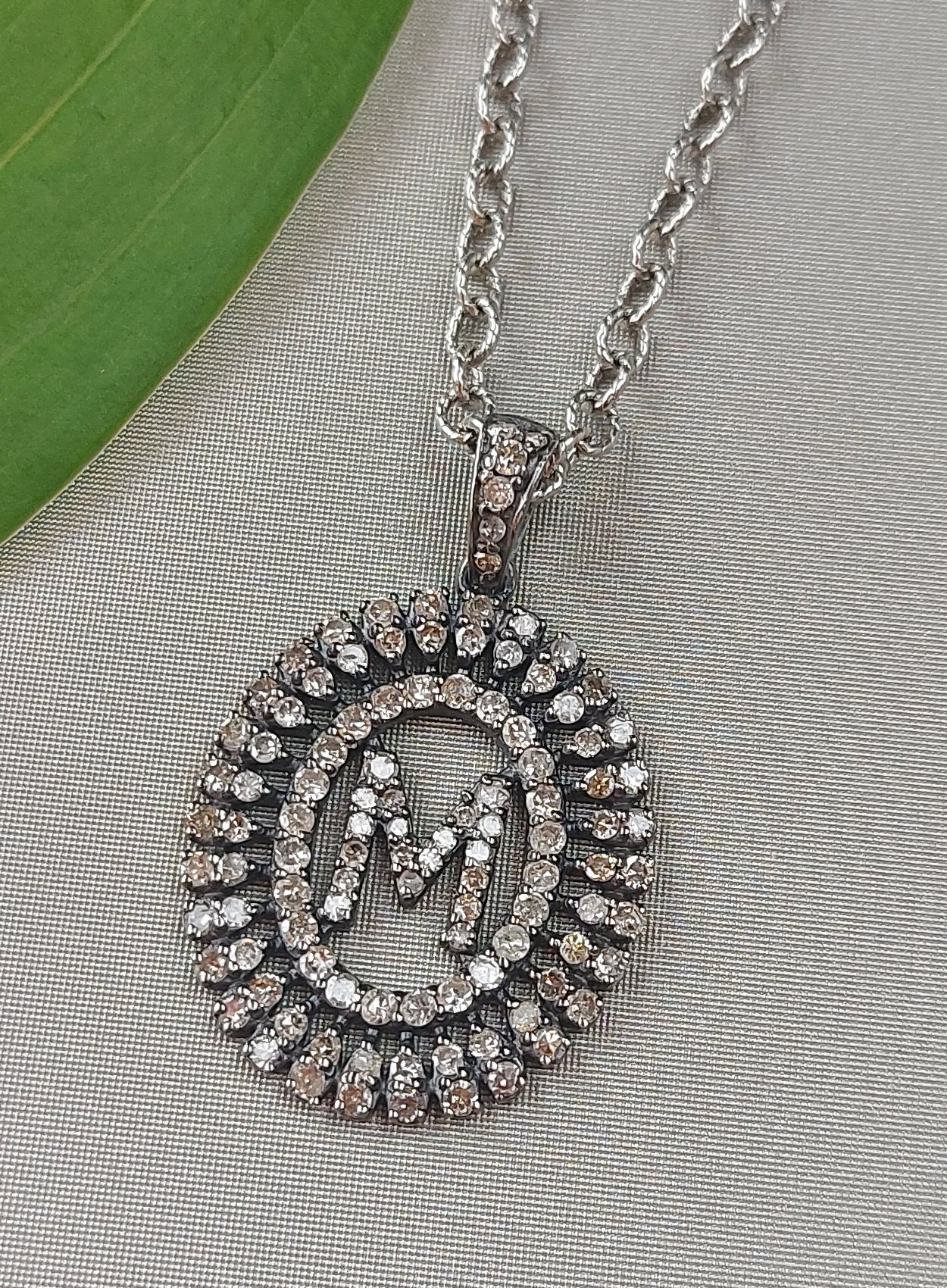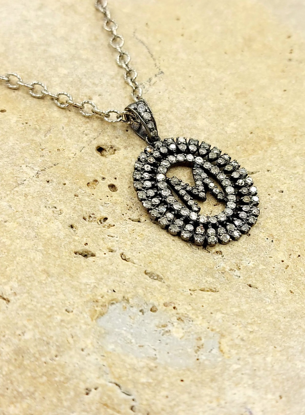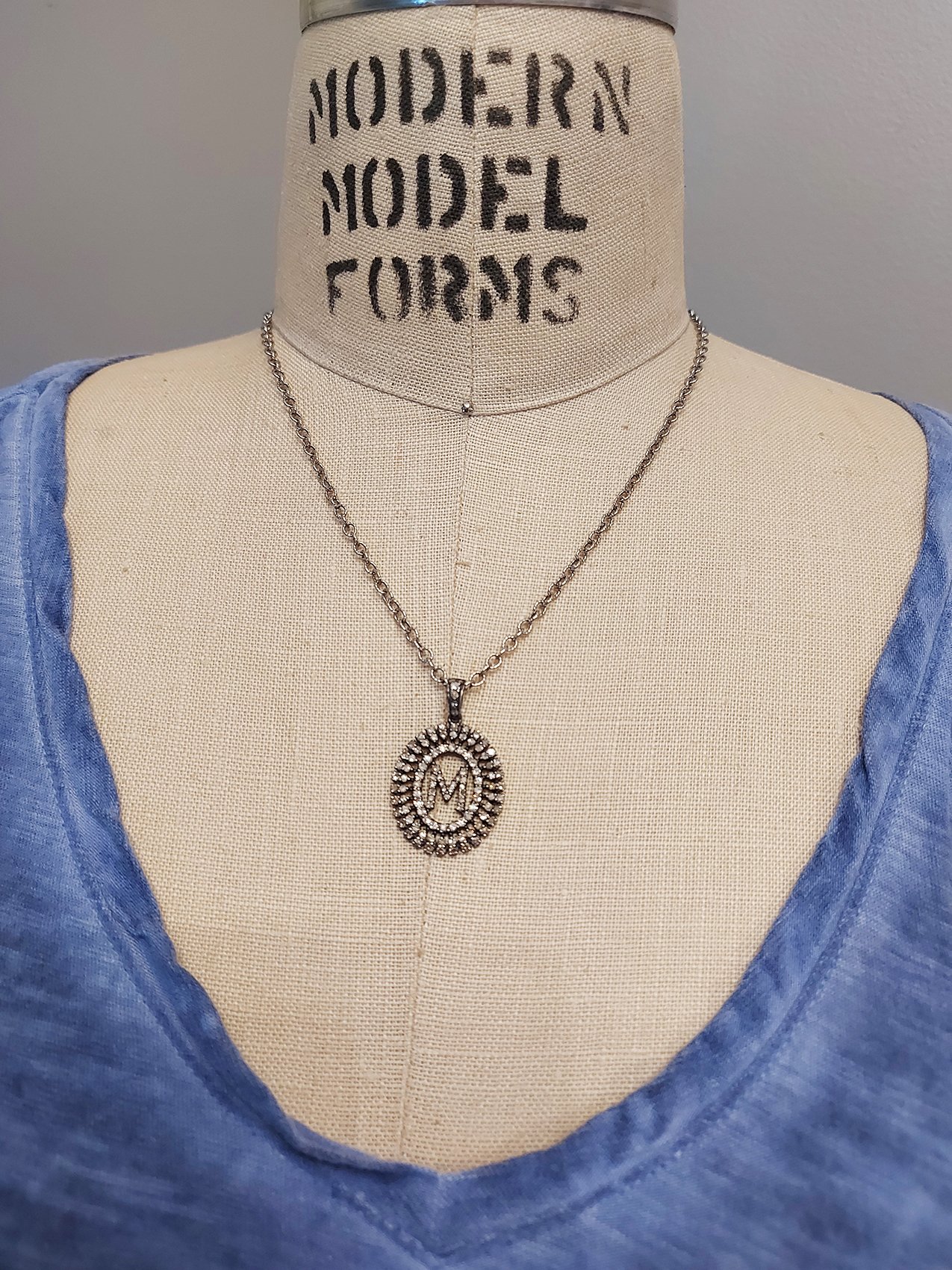 Baguette Diamond Monogram M Necklace on oxidized sterling silver chain. 16-18″ long necklace