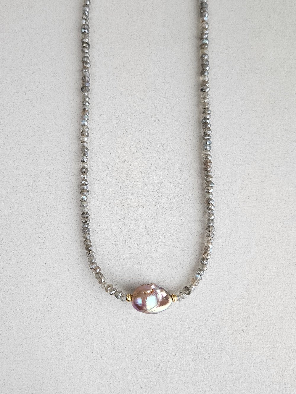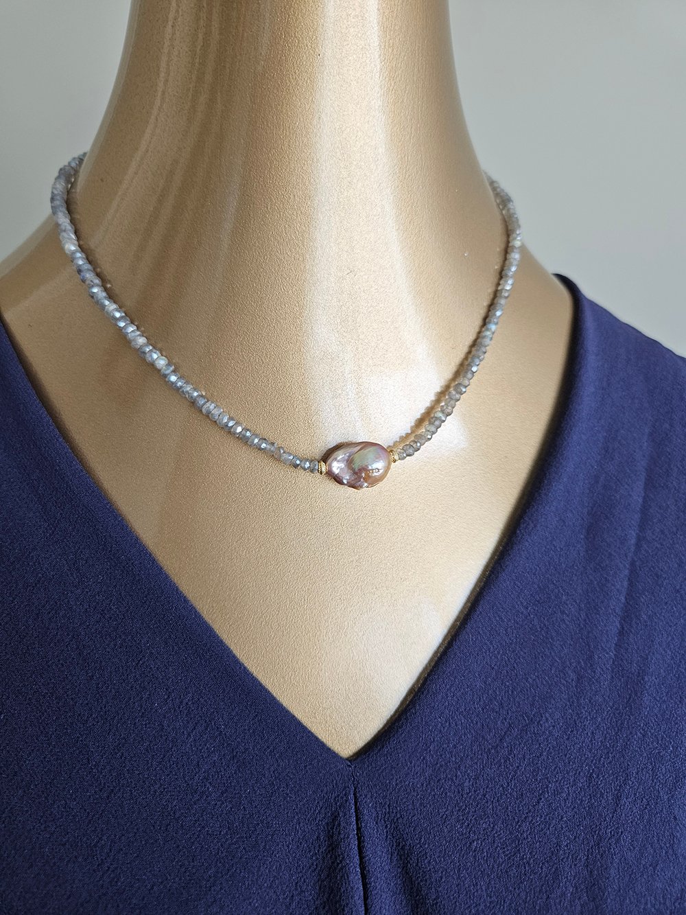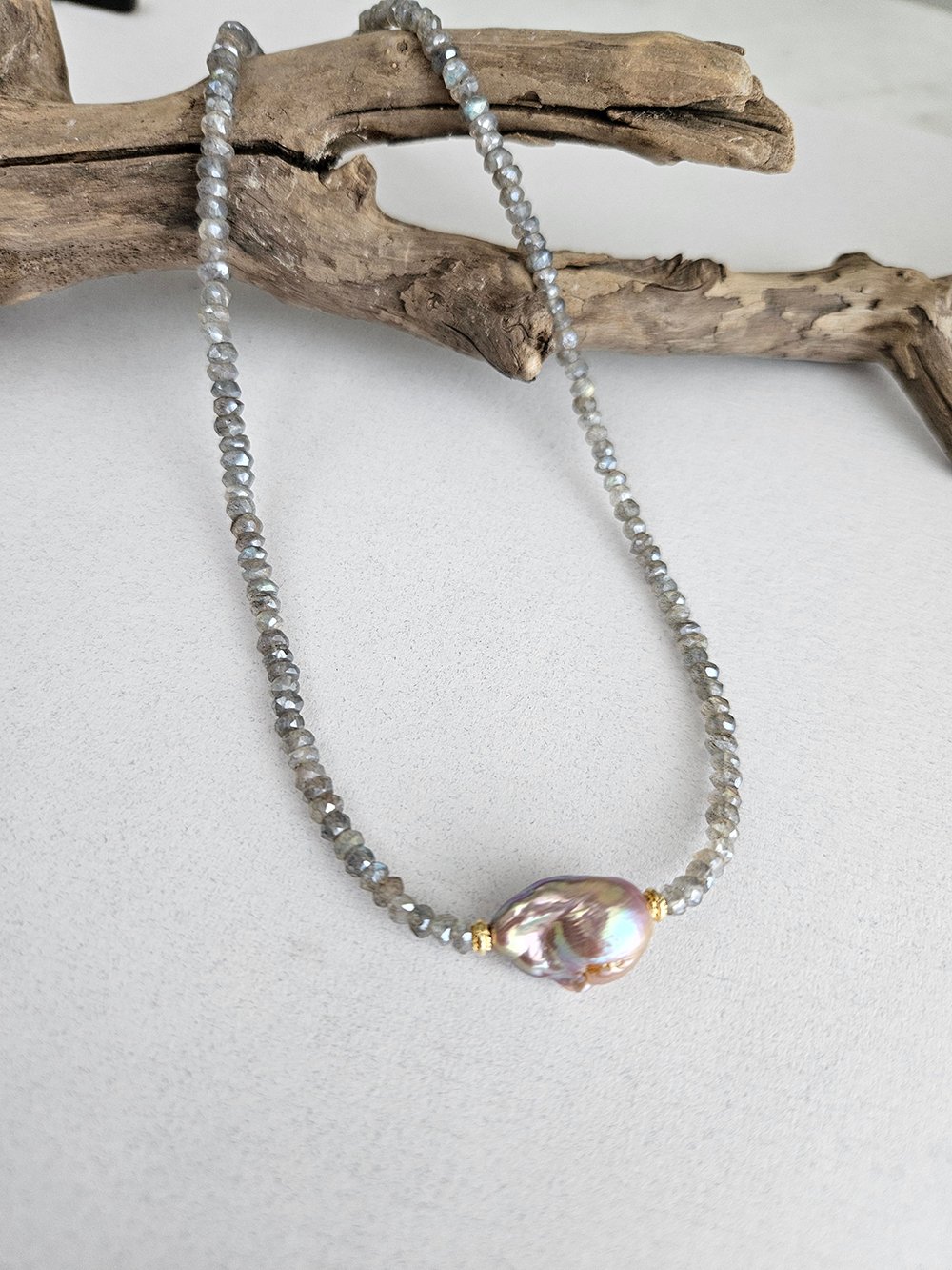 Baroque pearl necklace on a 16–18″ labradorite beaded chain with vermeil spacers and a 14k gold-filled clasp and extender—this baroque pearl necklace highlights a luminous pink-toned centerpiece with refined, natural elegance.