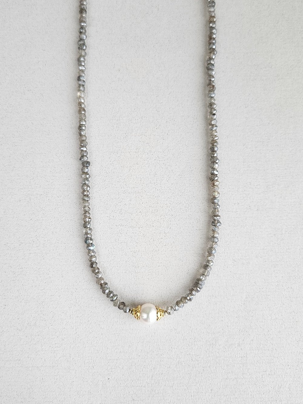 The labradorite beaded chain brings depth and dimension, with its muted tones and occasional flashes of light creating a quiet, captivating shimmer. This natural contrast balances the softness of the pearl, resulting in a composition that feels both grounded and luminous.