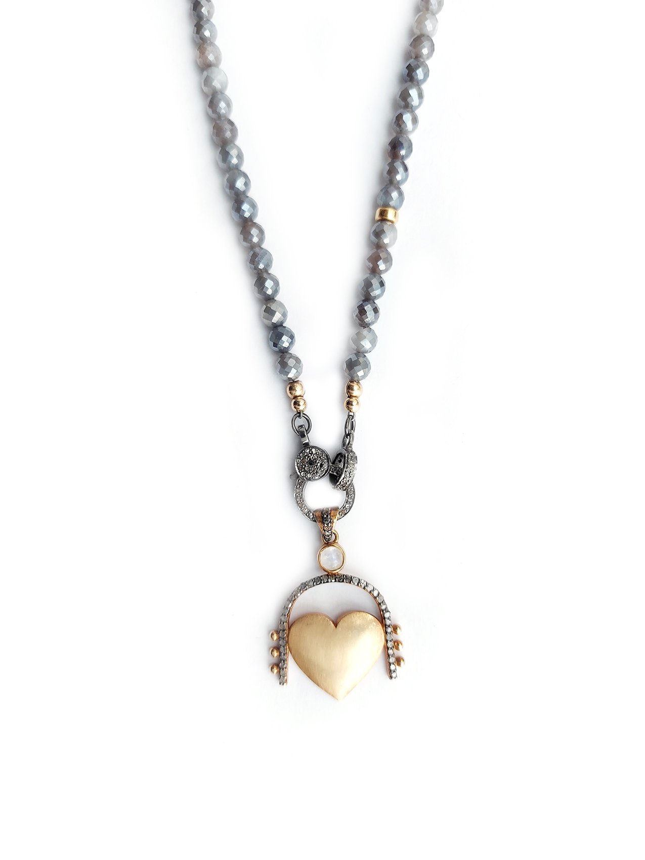 Introducing our exquisite gold heart necklace with diamonds and opal. This stunning piece is the epitome of elegance and grace, designed to capture hearts and turn heads. The heart pendant, adorned with sparkling diamonds, symbolizes love and affection, while the opal adds a touch of mystique and enchantment. The necklace is further enhanced by labradorite beads, which exude a captivating iridescence. Crafted with meticulous attention to detail and using only the finest materials, this necklace is a true statement of luxury and style. Wear it proudly and let its beauty create a lasting impression.