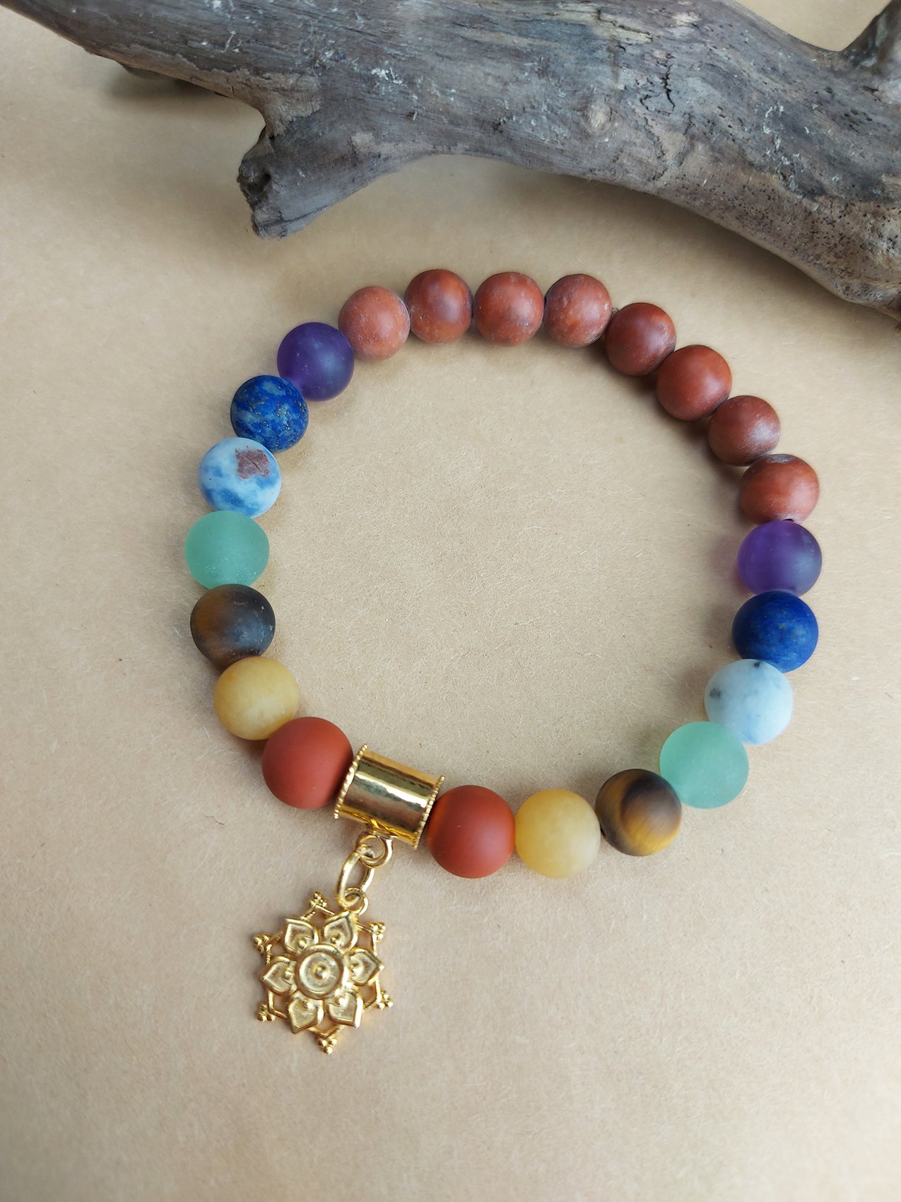 - Features natural healing stones like amethyst, lapis, tiger eye