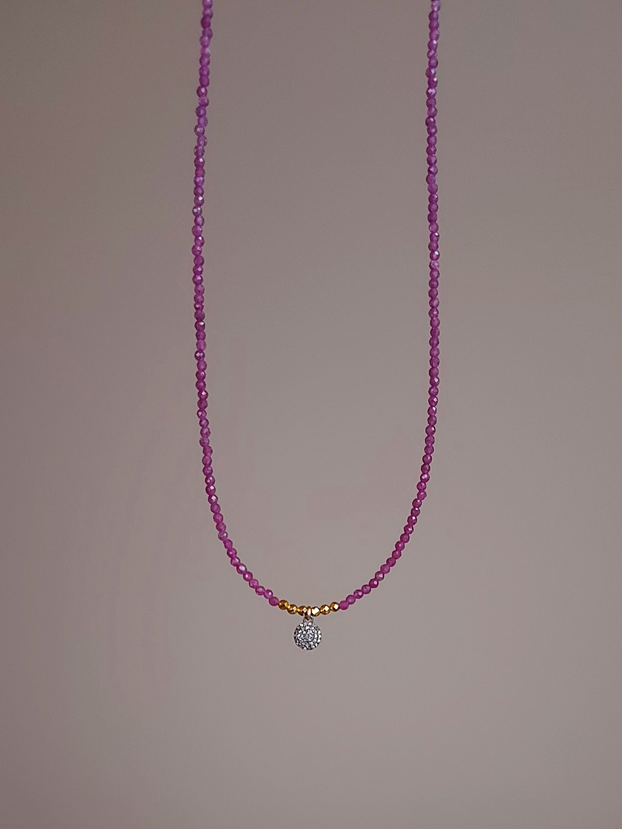 This diamond disc on ruby beaded necklace is a timeless and versatile piece that can be worn alone as a statement accessory or layered with other necklaces for a more personalized look. It is sure to be a cherished addition to any jewelry collection, making it a perfect gift for yourself or a loved one.
