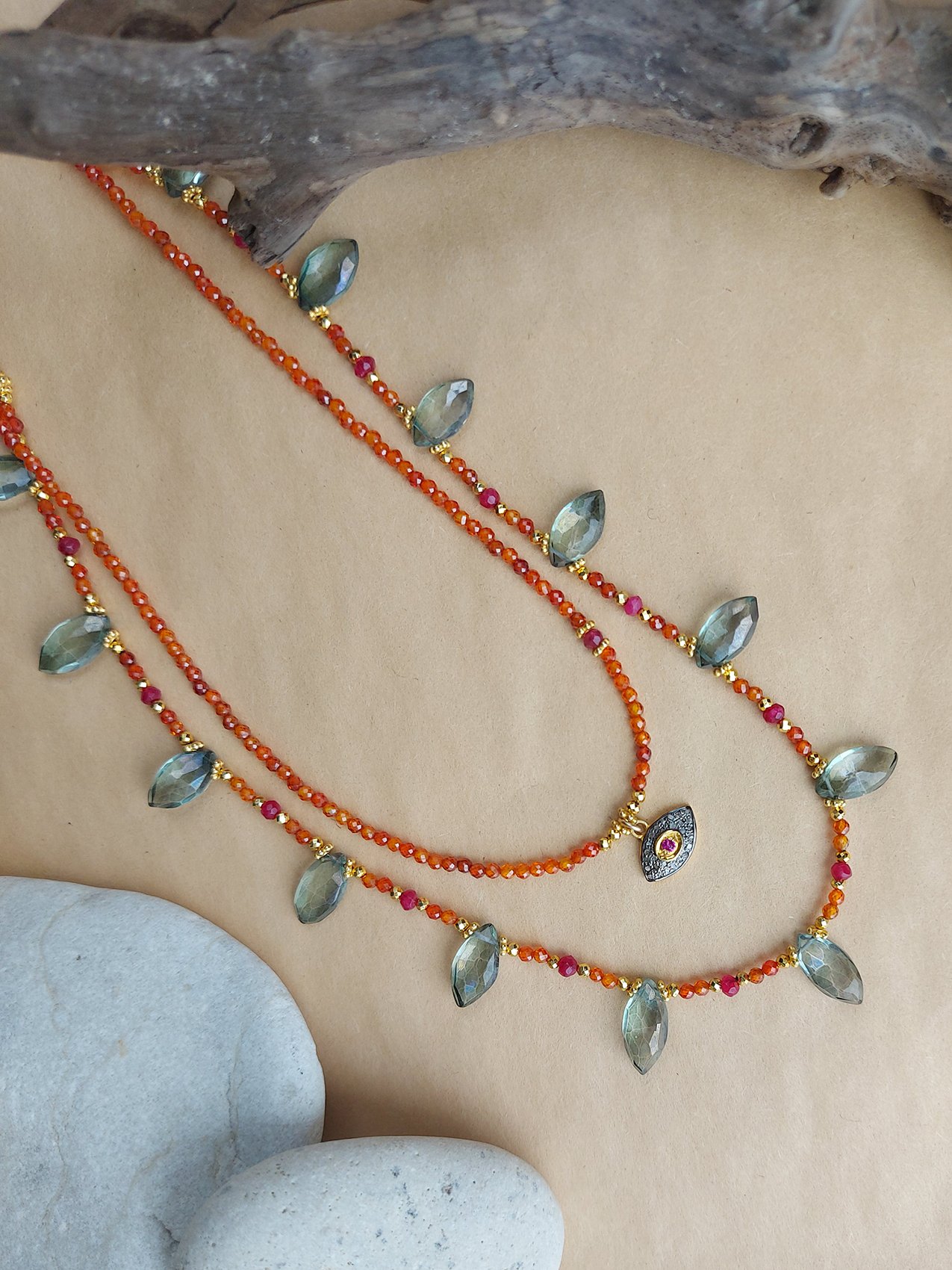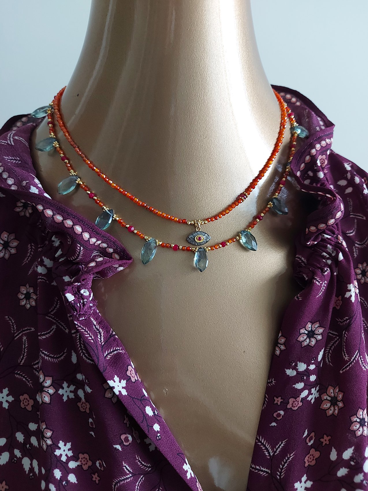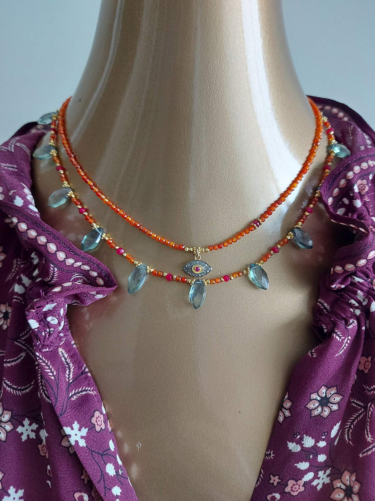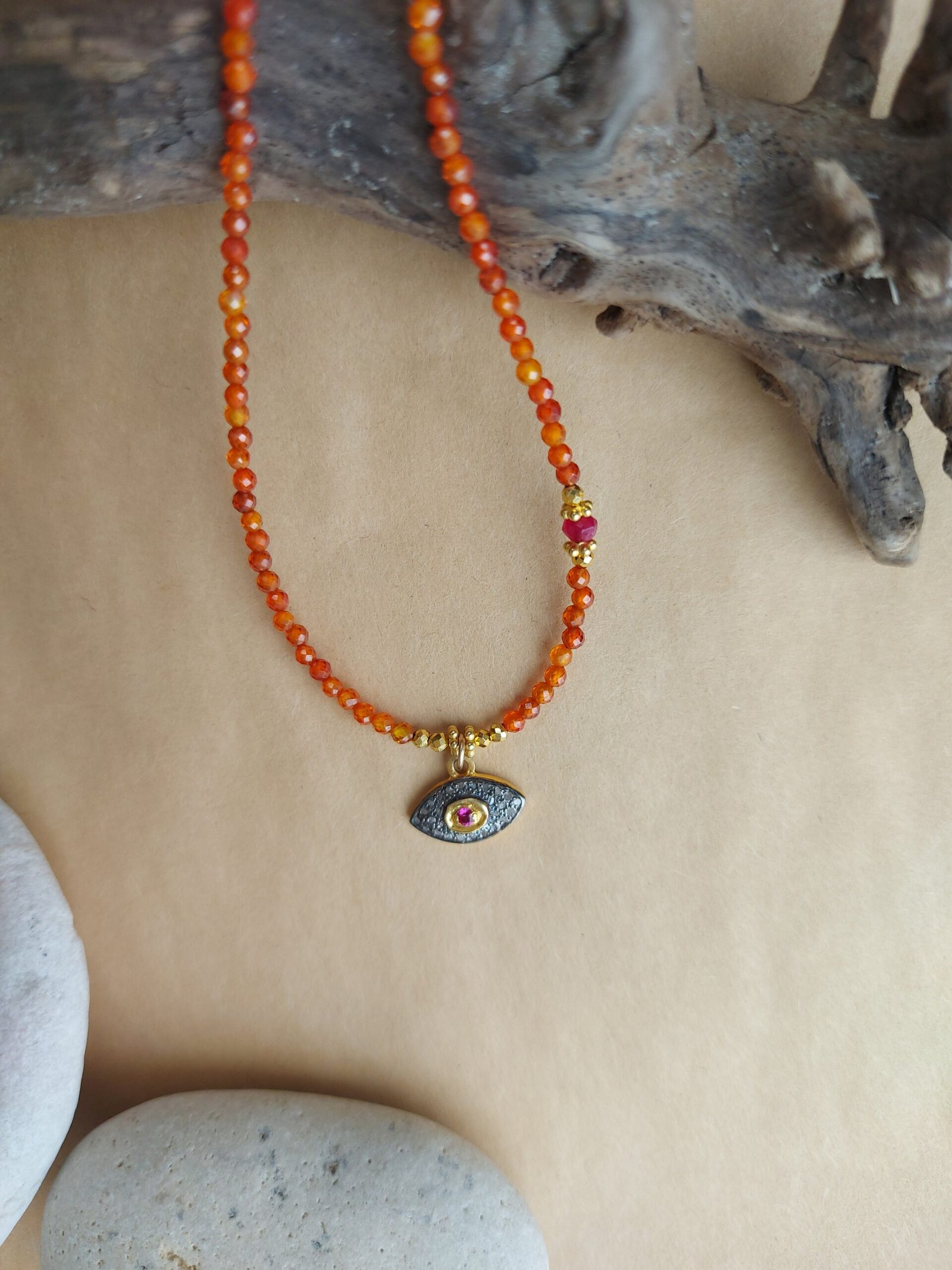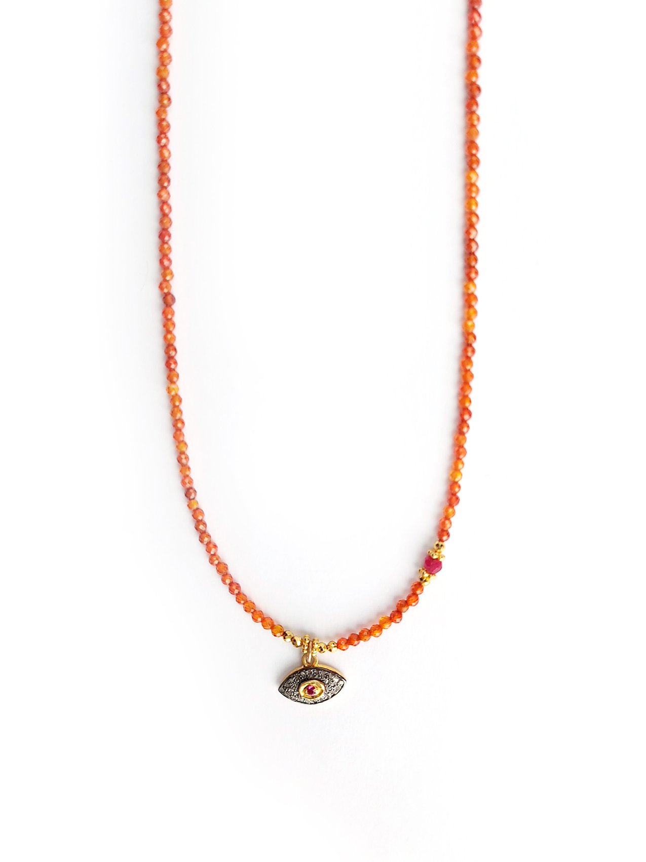 This stunning necklace taps into the spiritual symbolism of the evil eye – an ancient talisman believed to deflect harm and attract positivity. The diamond-studded pendant radiates an otherworldly glow, while the ruby accent stone amplifies its protective energy. Strung on a beaded chain of gleaming orange cubic zirconia, this necklace is a bold, beautiful way to harness the mystical forces of the universe. Whether you’re seeking spiritual guidance, emotional healing, or simply a stylish accessory to elevate your look, this necklace is a must-have.