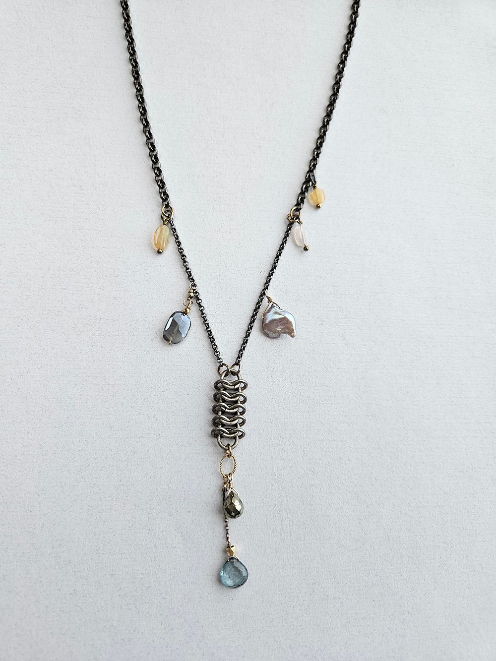 Each gemstone is carefully selected for its color, clarity, and energy. Green amethyst is known for promoting renewal and calm, while pyrite adds a subtle golden shimmer that enhances the necklace’s sophisticated charm. Freshwater pearls contribute timeless elegance, giving the necklace a soft, feminine glow.