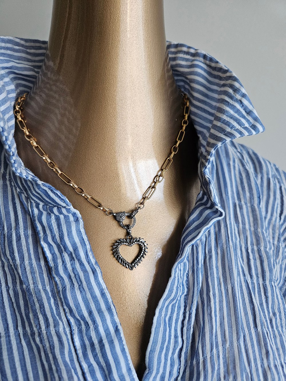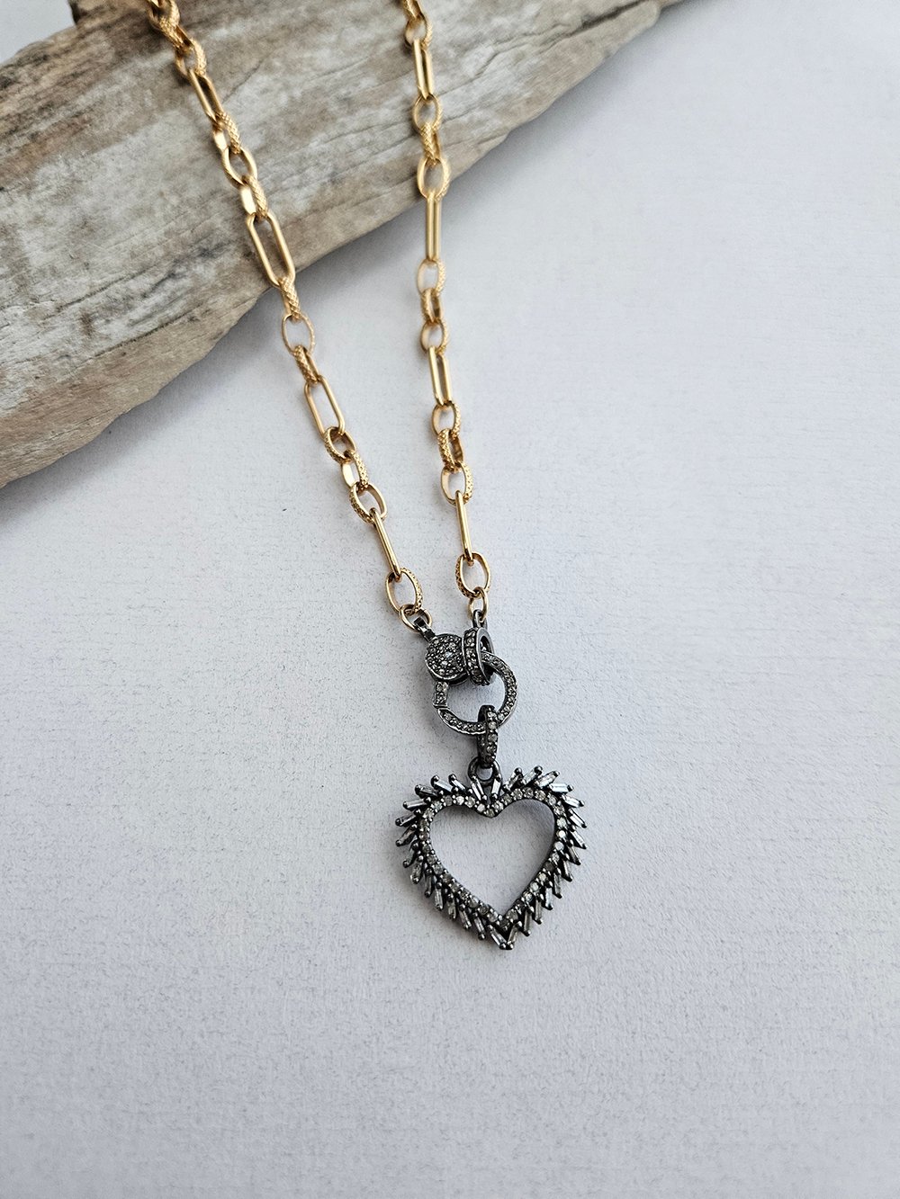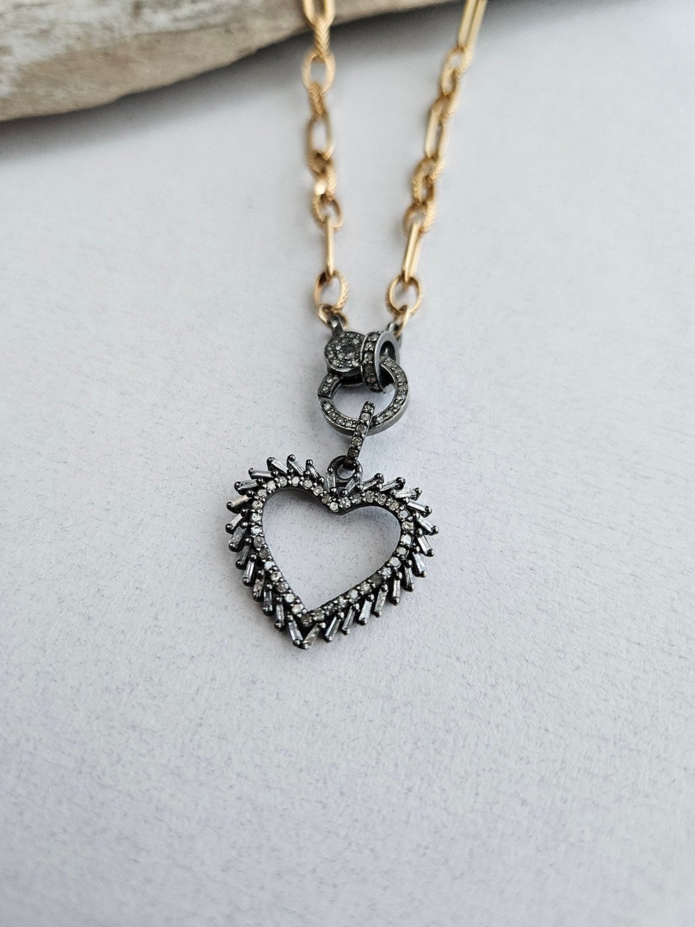 Handcrafted diamond necklace designed to capture timeless elegance and refined artisan craftsmanship through a baguette diamond-studded vintage-style heart pendant suspended on a 14k gold filled chain with a pave diamond lobster clasp. Measuring 16 inches in length, this necklace offers a delicate yet striking statement that can be worn alone for a touch of sophistication or layered for a richer, more luxurious look. Each handcrafted diamond necklace is meticulously made in the USA, reflecting Avaasi’s commitment to slow fashion, precision artisan techniques, and one-of-a-kind design. The sparkling baguette diamonds on the heart pendant catch the light beautifully, adding depth, brilliance, and a touch of vintage charm to the piece, while the pave diamond clasp enhances the overall elegance and refinement. Designed for women who appreciate jewelry with both meaning and style, this artisan necklace elevates everyday ensembles and complements special occasion attire with grace and luxury. Whether gifted or added to a personal collection, this handcrafted diamond necklace embodies timeless beauty, sophistication, and a wearable expression of intentional design, making it a treasured addition to any jewelry lover’s wardrobe.