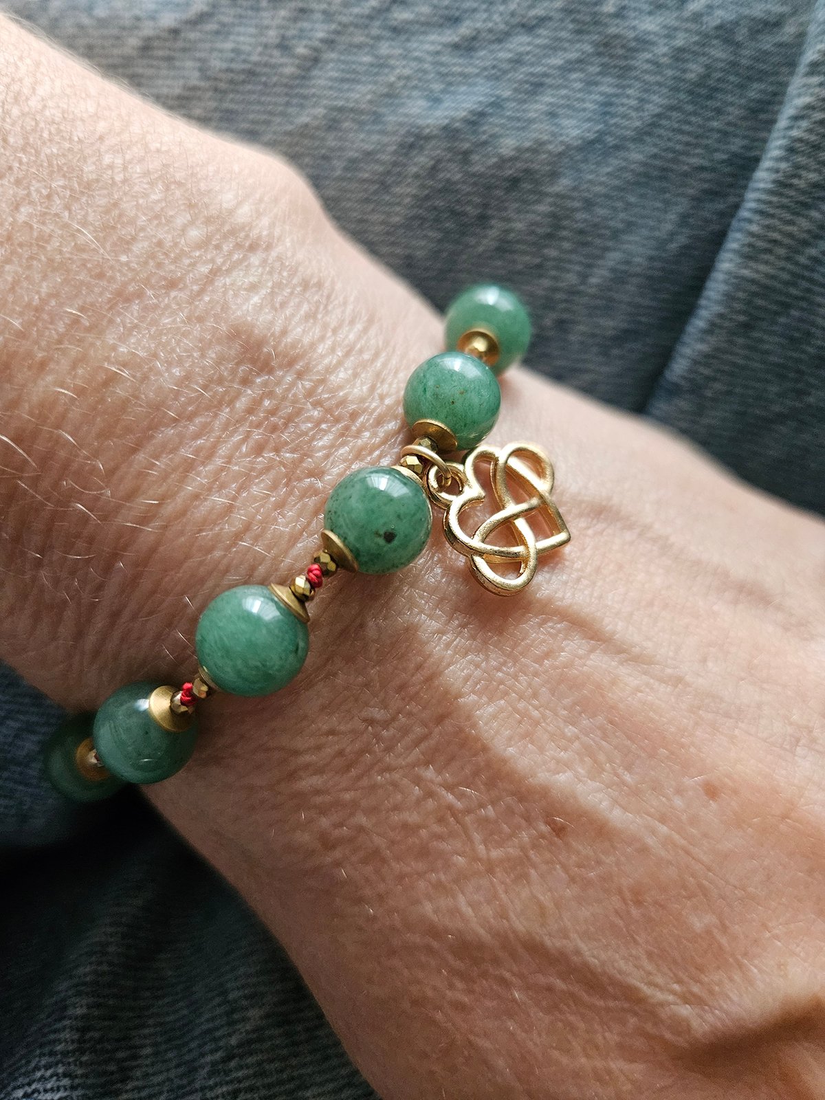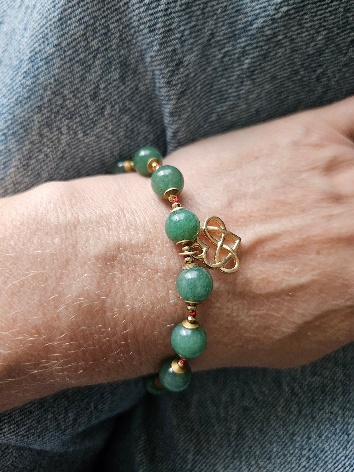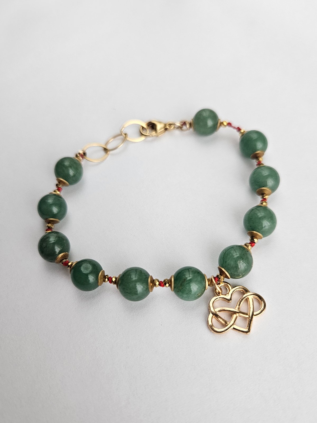 A vibrant strand of Green Jade beads is hand-knotted on rich red silk, creating a striking balance of color and intention. Each gemstone feels cool, smooth, and grounding against the skin, while the 14k gold-fill clasp adds a refined touch of lasting elegance. A delicate gold-tone heart charm completes the design with a whisper of romance.