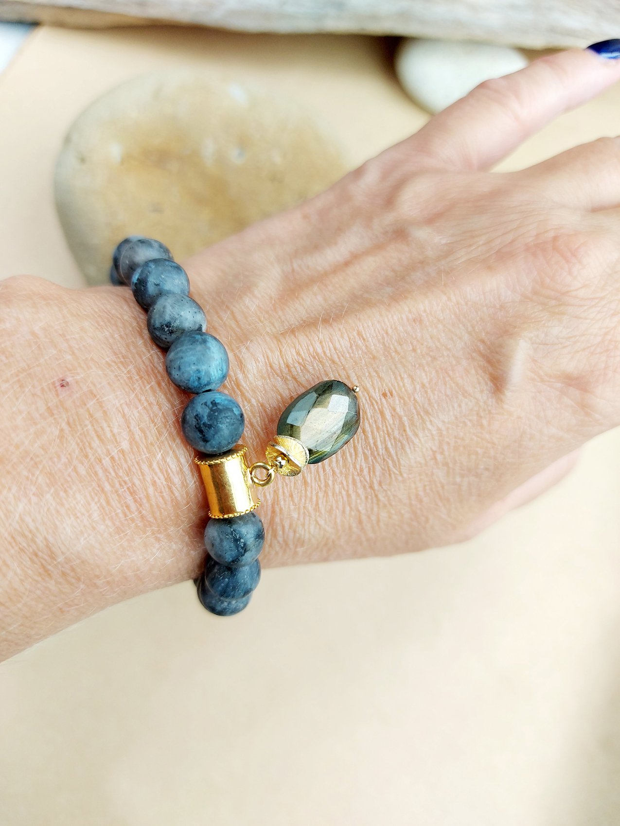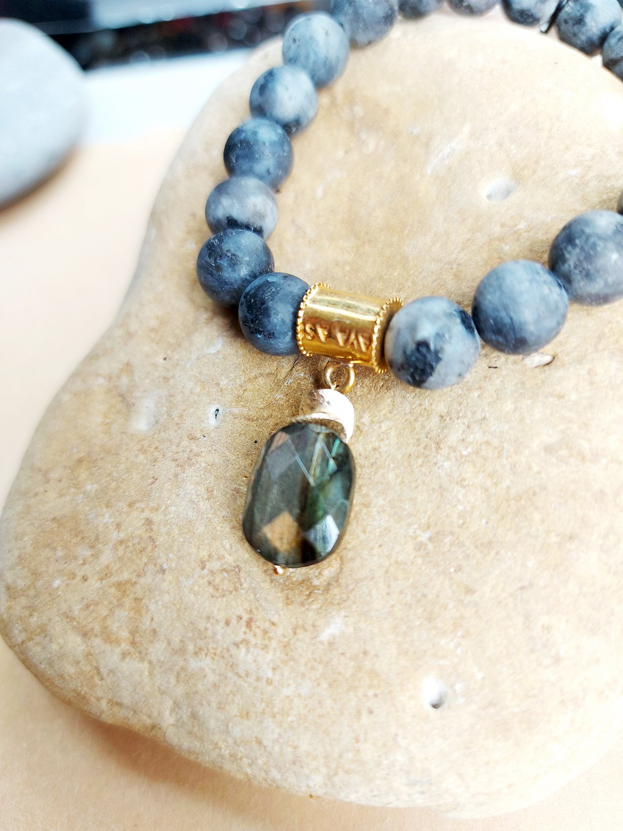 Faceted Oval pendant on signature Avaasi bail. Black Labradorite stretch bracelet.