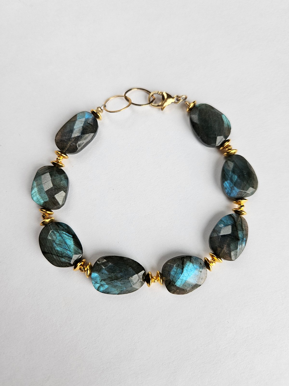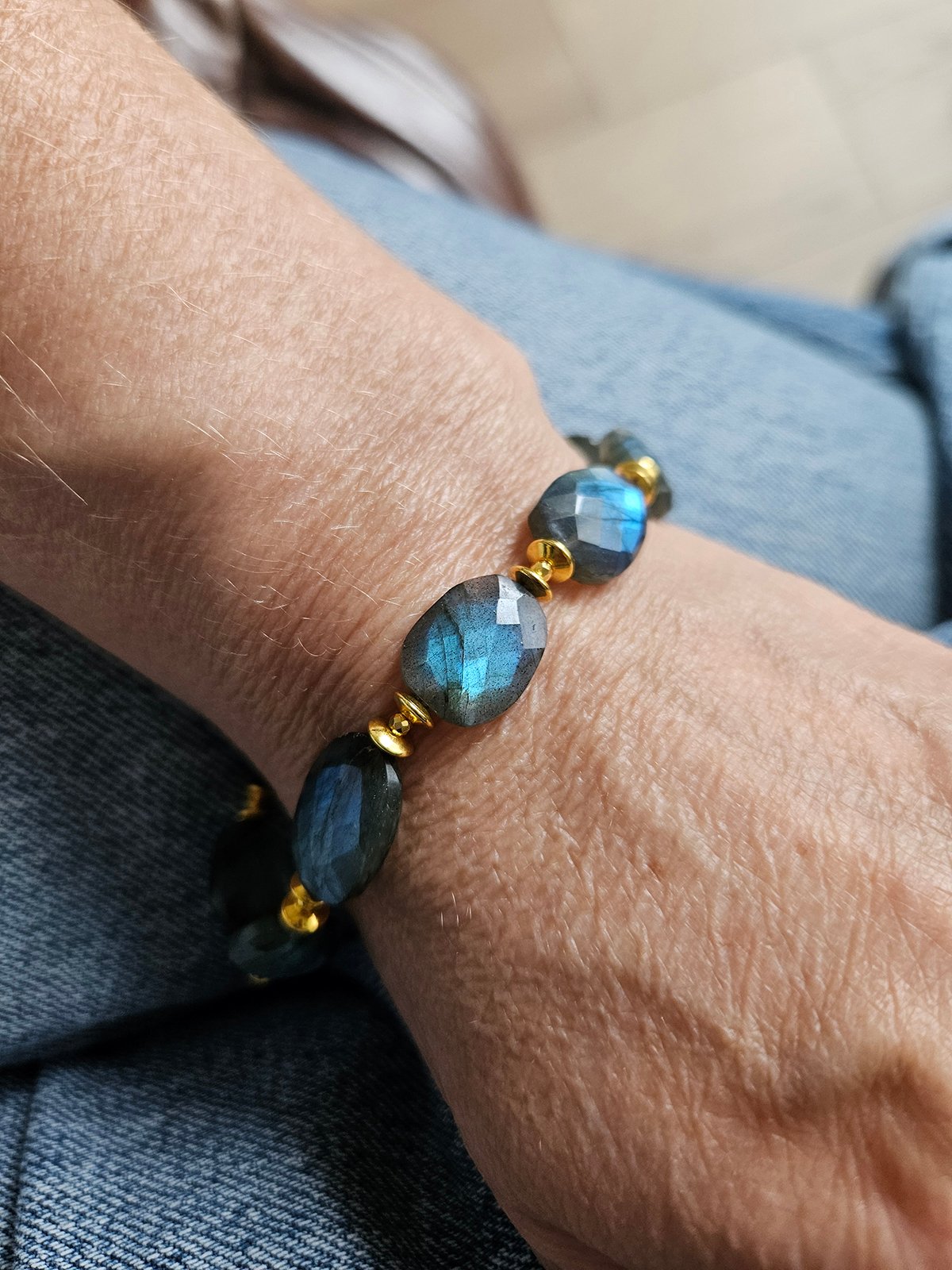A stunning strand of premium Labradorite coins, each one shimmering with flashes of blue and silver, creates a bracelet that feels truly magical. The quality is absolutely exceptional—smooth, luminous, and full of natural fire that catches the light with every movement.