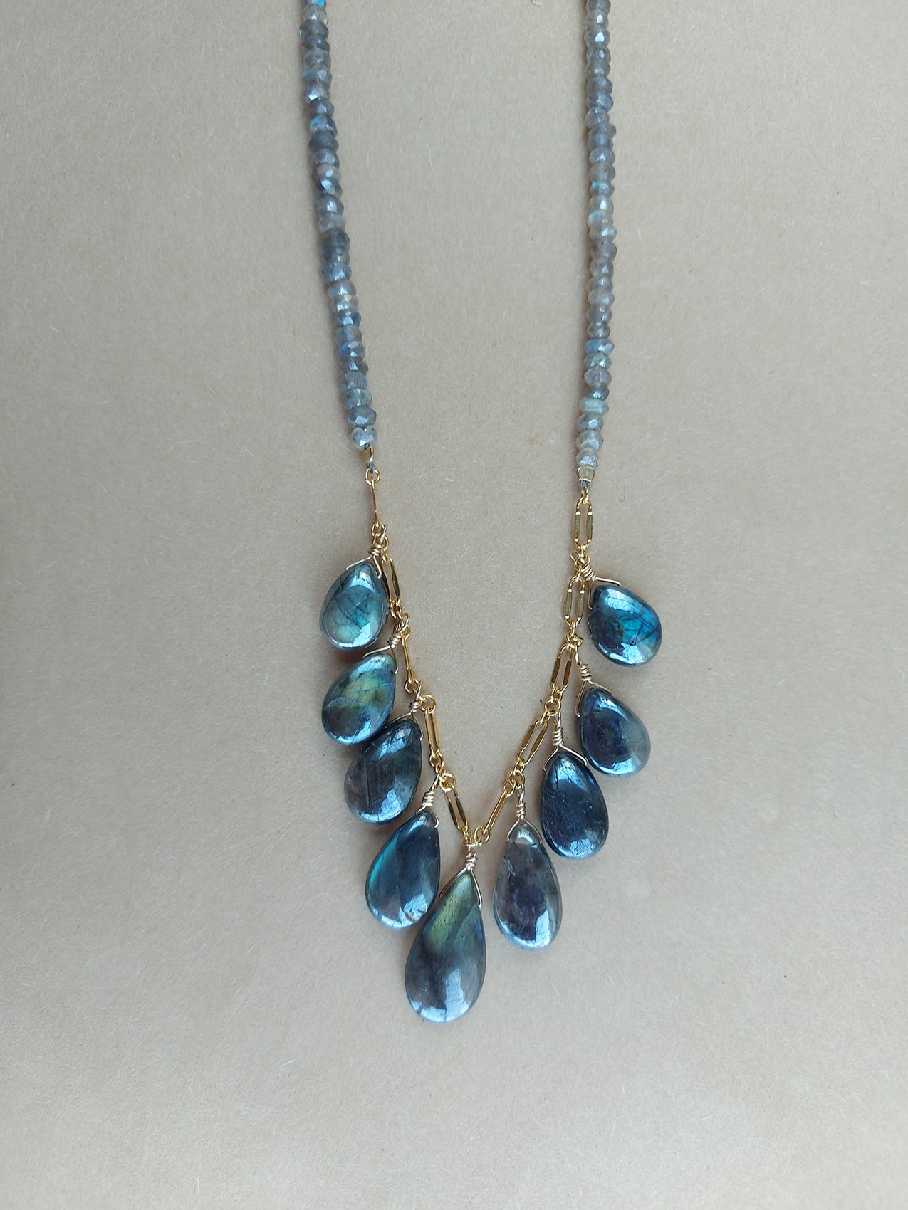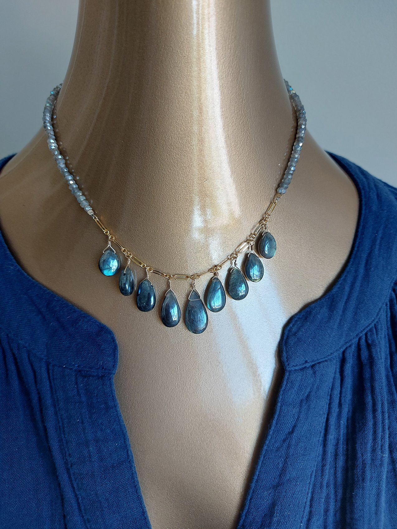 Labradorite Drops on Labradorite beaded chain and 14k gold chain and closure